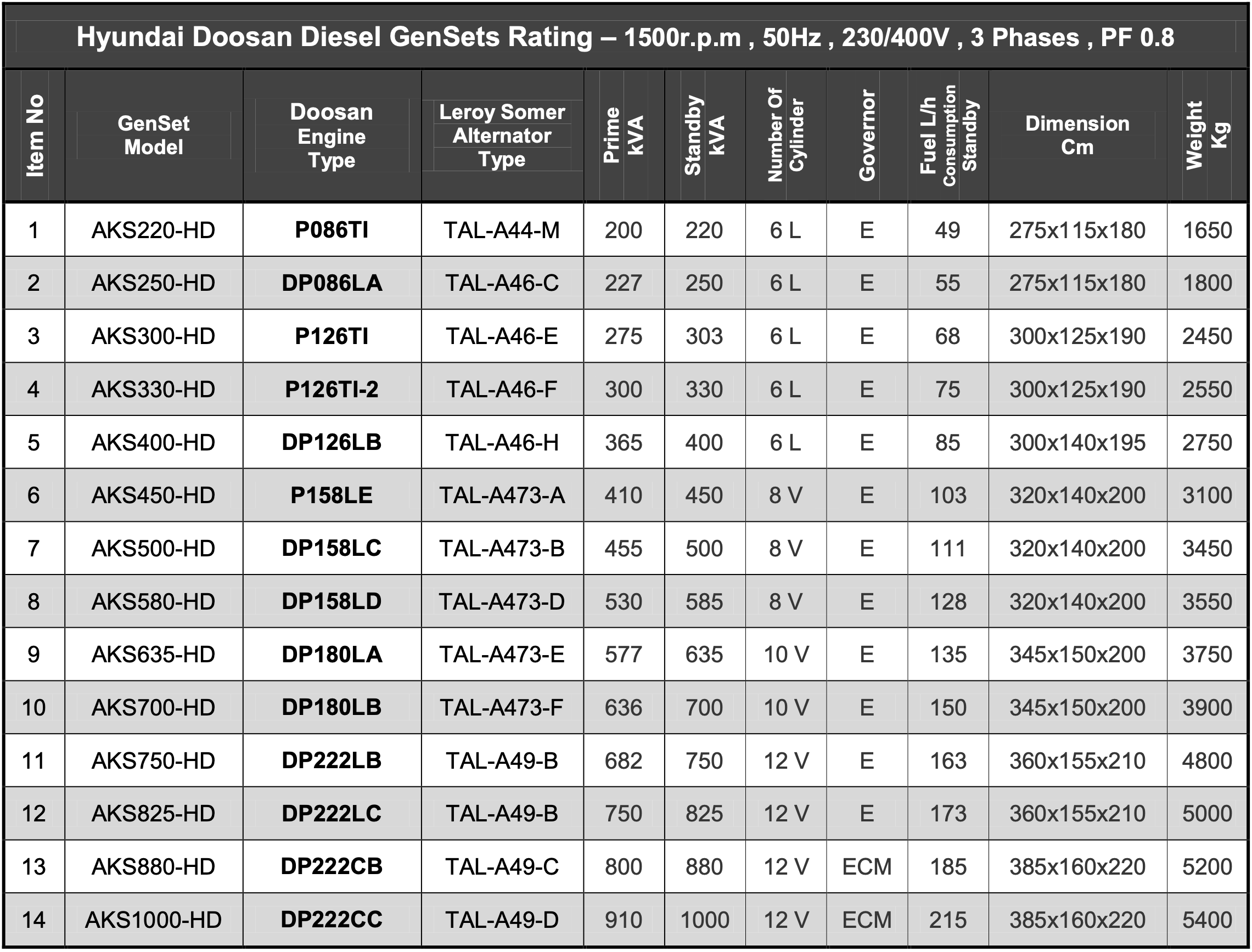 مولدهای برق ديزلی مجهز به موتورهای هیوندایی دوسان Hyundai Doosan و ژنراتورهای لروی سومر Leroy Somer که با لوازم و قطعات فابريک کوپل میگردند.
