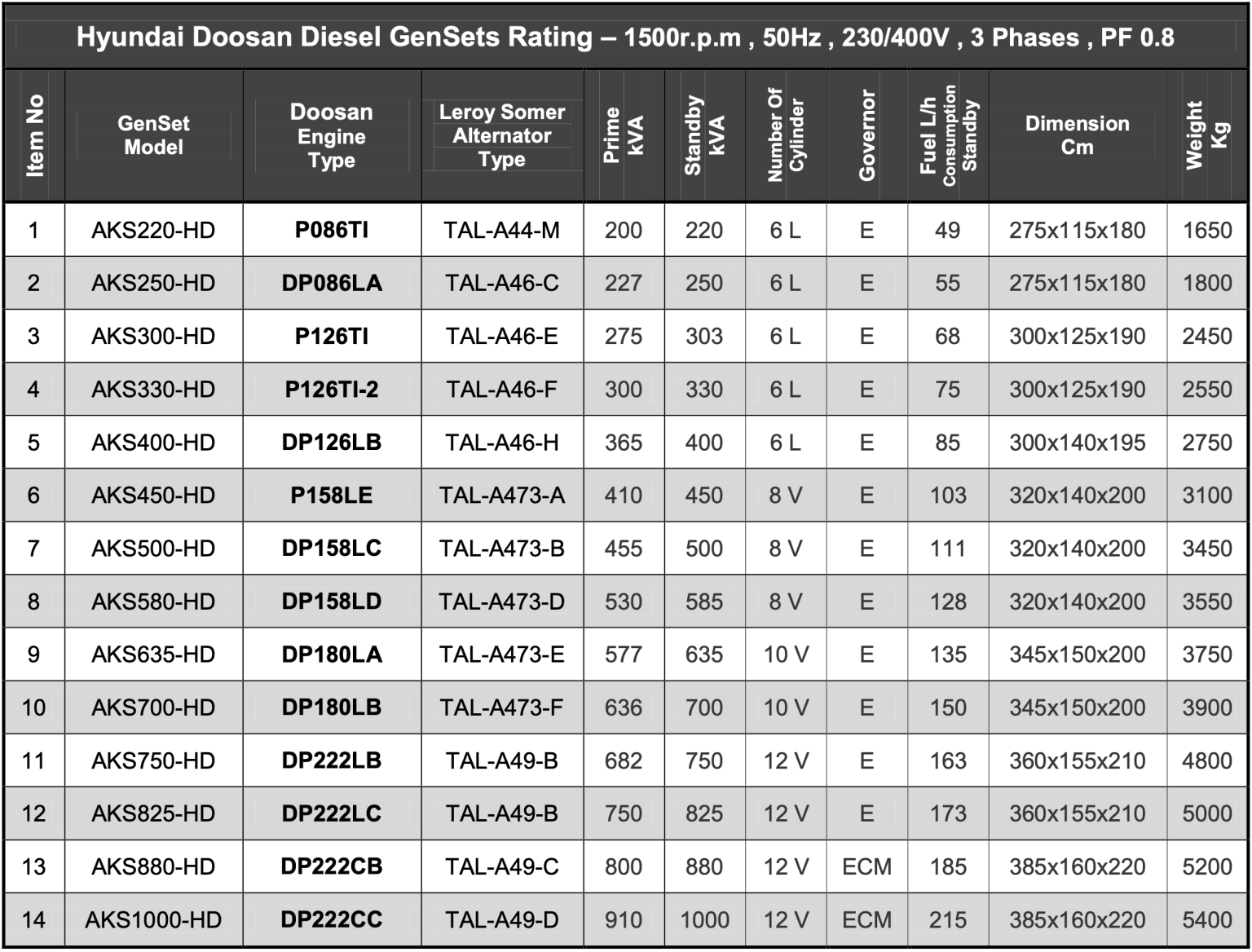 1500r.p.m , 50Hz , 230/400V , 3 Phases , PF 0.8